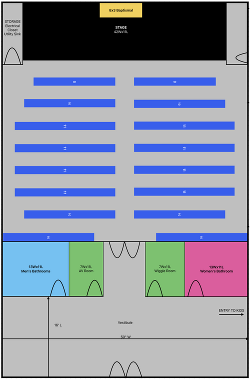 Our current building will be renovated & given a facelift to become our NextGen Community Center. The lower level connecting into the brand new Equipping & Training Center will lose some walls, gain some paint, and become dedicated to Kids Ministry. Back rooms which are currently unused will become a "bullpen" office for a collaborative work space, meeting room for counseling & staff meetings, and recording space for online discipleship resources.